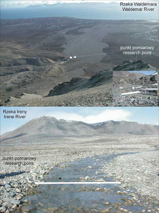 Zarys treści: W sezonach letnich 2001 i 2003 roku przeprowadzono szczegółowe badania ablacji i odpływu z lodowca Waldemara i z lodowca Ireny. Przeanalizowano zmienność czasową i przestrzenną ablacji. Oszacowano całkowitą wielkość ablacji lodowca Waldemara na 112,7 cm e.w. (ekwiwalentu wodnego) w roku 2001 i 118,1 cm e.w. w roku 2003. Z kolei w przypadku lodowca Ireny ablacja wyniosła w tych latach odpowiednio 126,1 i 111,1 cm e.w.. Dokonano analizy relacji pomiędzy natężeniem przepływu rzeki Waldemara i Ireny, a wielkością ablacji lodowców przez nie odwadnianych. Określono zmienność natężenia przepływu rzeki Waldemara i Ireny. Oceniono udział ablacji powierzchniowej w całkowitym odpływie z lodowca Waldemara na 50 % w roku 2001 i 63 % w roku 2003.