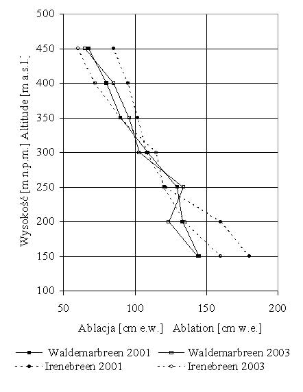 Charakterystyczną cechą większości lodowców jest zmniejszanie się ablacji wraz z wysokością jego położenia nad poziomem morza. Wysoko położone partie lodowca są pod wpływem oddziaływania niższych wartości temperatury powietrza i ablacja jest tam znacznie mniejsza lub nie zachodzi w ogóle. Z kolei najniższa część lodowca znajduje się na ogół w strefie cieplejszych mas powietrza, a ablacja jest tam zdecydowanie większa. Często znaczący wpływ na zróżnicowanie wysokościowe wielkości ablacji mają lokalne warunki danego lodowca, m.in. takie jak: nachylenie, ekspozycja, otoczenie stokami górskimi, stopień pokrycia materiałem morenowym, sieć cieków supraglacjalnych. W przypadku lodowca Waldemara największe wartości ablacji w analizowanych latach stwierdzono do wysokości 250 m n.p.m.. Następnie ablacja wyraźnie się zmniejszała. Podobna sytuacja miała miejsce w przypadku lodowca Ireny (rys. 2).