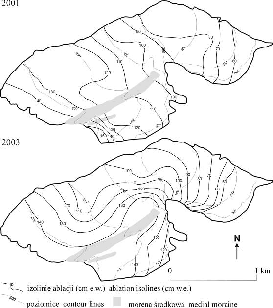 Przestrzenne zróżnicowanie ablacji lodowca Waldemara zarówno w sezonie letnim 2001 roku, jak i 2003 było większe, aniżeli w przypadku lodowca Ireny (rys. 3, 4). Było to przede wszystkim spowodowane warunkami pogodowymi panującymi w poszczególnych jego częściach, a także ukształtowaniem powierzchni. Lodowiec Waldemara charakteryzuje się dużym nachyleniem nie tylko w strefie czołowej, ale także w kierunku moreny środkowej. Powoduje to zwiększenie powierzchni o ekspozycji południowej, rozwój sieci cieków supraglacjalnych oraz zwiększone pokrycie materiałem morenowym. Efektem tego jest zwiększone w tym miejscu topnienie lodowca. W przestrzennej zmienności ablacji lodowca Ireny również stwierdzono pewne prawidłowości. Największa ablacja wystąpiła w północnej części strefy czołowej lodowca (powyżej 160 cm e.w.), a najmniejsza na obszarze pola akumulacyjnego (rys. 4). Niższe wartości ablacji wystąpiły także w południowo-środkowej części, u podnóża stoków górskich, które w przypadku tego lodowca istotnie wpływają na zacienienie jego powierzchni. Ma to bardzo duże znaczenie w kształtowaniu wielkości ablacji.