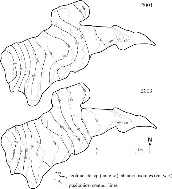 Pomiary ablacji prowadzone były w oparciu o sieć tyczek ablacyjnych zainstalowanych na lodowcach na głębokość 10 m. Pomiary wykonywane były co 5-7 dni. Pozwoliło to określić czasową i przestrzenną zmienność tego zjawiska. Tyczki ablacyjne zlokalizowane były we wszystkich przedziałach wysokościowych. Wartości ablacji zostały interpolowane na całą powierzchnię lodowca. Dzięki temu uzyskano ablację w poszczególnych przedziałach wysokościowych. Ponadto obliczono wielkość ablacji dla strefy czołowej i strefy akumulacyjnej tych lodowców.