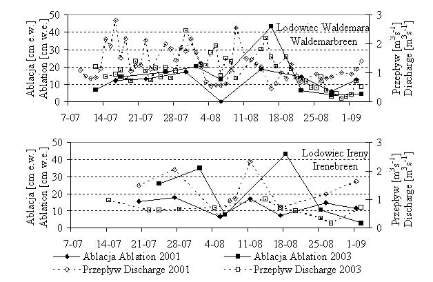 W roku 2003 największa ablacja wystąpiła w strefie czołowej lodowca, do 140 cm e.w., a na obszarze pola akumulacyjnego była o 100 cm e.w. niższa. Na lodowcu Ireny ablacja w strefie czołowej była największa i wyniosła do 160 cm e.w., natomiast najmniejszymi wartościami charakteryzowała się część akumulacyjna. Całkowita ablacja lodowca Waldemara w sezonie letnim 2001 roku wyniosła 112,7 cm e.w., a w roku 2003, 118,1 cm e.w.. Natomiast lodowca Ireny odpowiednio 126,1 i 111,1 cm e.w.. W roku 2001 ablacja lodowca Waldemara była nieco niższa, aniżeli lodowca Ireny. Z kolei w roku 2003 odnotowano sytuacje odwrotną. Było to spowodowane przede wszystkim niższą ablacją w części akumulacyjnej lodowca Ireny. Niższa ablacja w tej części lodowca spowodowana była większą, niż w roku 2001 zimową akumulacją śniegu, który zalegał tam do końca sezonu ablacyjnego.