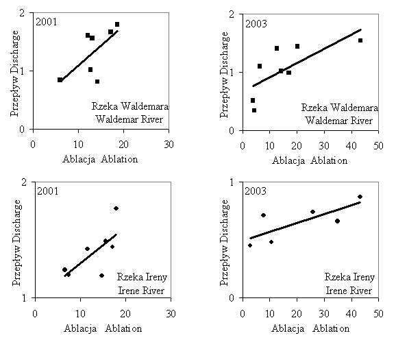W sezonie letnim 2001 i 2003 roku ablacja miała wyraźny wpływ na kształtowanie wielkości natężenia przepływu rzeki Waldemara. Świadczy o tym zależność korelacyjna pomiędzy ablacją, a przepływem (rys. 6).