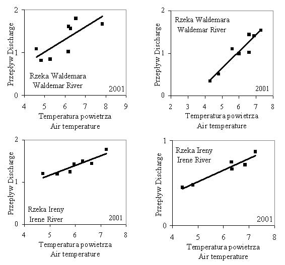 Należy również zaznaczyć, że hydrogramy odpływu rzeki Waldemara i Ireny w sezonach letnich 2001 i 2003 roku nawiązują wyraźnie do przebiegu warunków pogodowych w tych sezonach. Zależność korelacyjna pomiędzy natężeniem przepływu rzeki Waldemara, a średnią dobową temperaturą powietrza była zbliżona do rzeki Ireny (rys. 7). Współczynniki korelacji pomiędzy tymi parametrami wyniosły 0,76 w roku 2001 i 0,94 w roku 2003 w przypadku natężenia przepływu rzeki Waldemara. Natomiast dla rzeki Ireny wyniosły one odpowiednio 0,91 i 0,97.