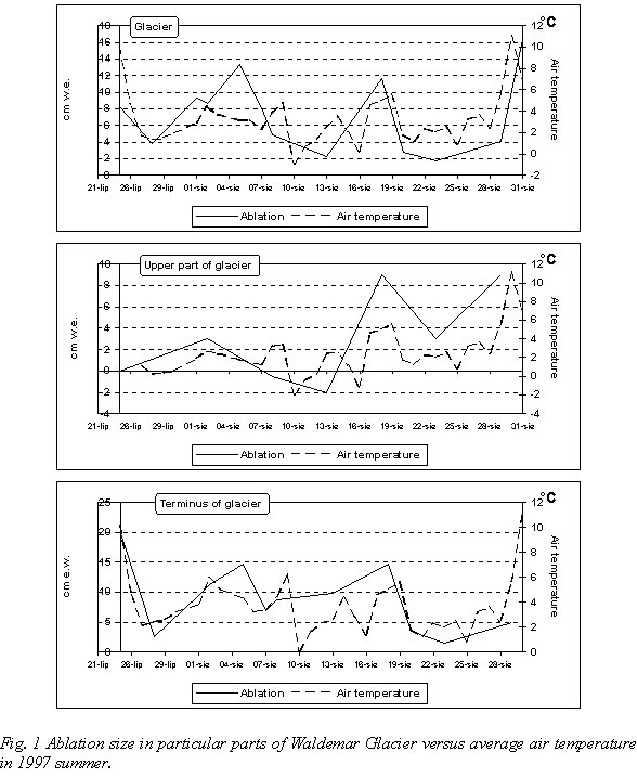 The Waldemar Glacier possesses an area of 2.66 m2 and occupies 61 % of the basin closed by the ice-moraine ridges at the varine of the river. The ice cirque lies at 380-490 m a.s.l. and the front of the glacier at 130 m a.s.l.. The ablation measurements were taken every 5 days in 30 cities. Aluminium ablation poles were installed 1.1 m below ground level. To assess ablation, the figures from the measure sites installed on Waldemar Glacier in April and May 1997 were used as well.