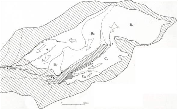 Fig. 2 Characteristic balance areas on the Waldemarbreen - division (summer 1997) Outflows measurements points: number - stream bed -the dehydrated area of the glacier 1 - the Waldemar river - A+B+C 2 - the stream bed dehydrating the northern part of the glacier - A 3 - the stream bed dehydrating the southern part of the glacier - B+C 4 - the outflow from the dammed lake - C+BA 5 - the stream bed going parallel with the central moraine - BB 6 - the inflow to the dammed lake - CA+BA 7 - the stream bed flowing from firn - BA B = BA+BB+BC; C = CA+CB