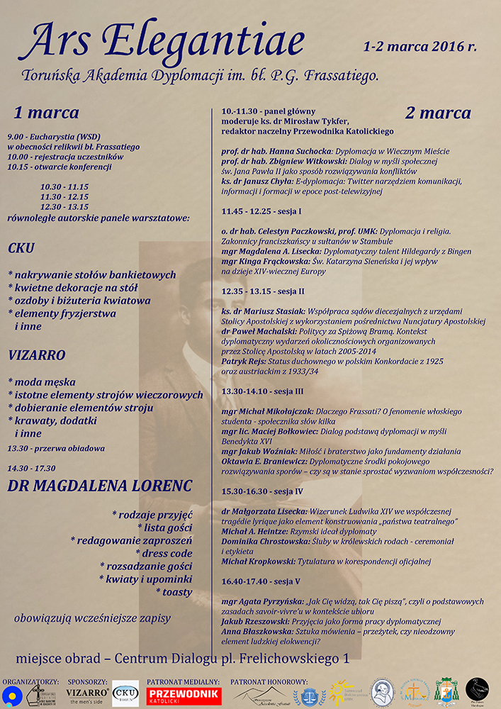 Serdecznie zapraszamy do udziału w konferencji: "Ars elegantiae. Toruńska Akademia Dyplomacji im. bł. PG. Frassatiego" organizowanej przez Doktorantów WT UMK we współpracy z Katedrą Teologii Praktycznej WT UMK, Katedrą Teologii Fundamentalnej i Dogmatycznej WT UMK i Katedrą Prawa Konstytucyjnego WPiA UMK oraz Koła Naukowego Cooperatores Veritatis im. Benedykta XVI.