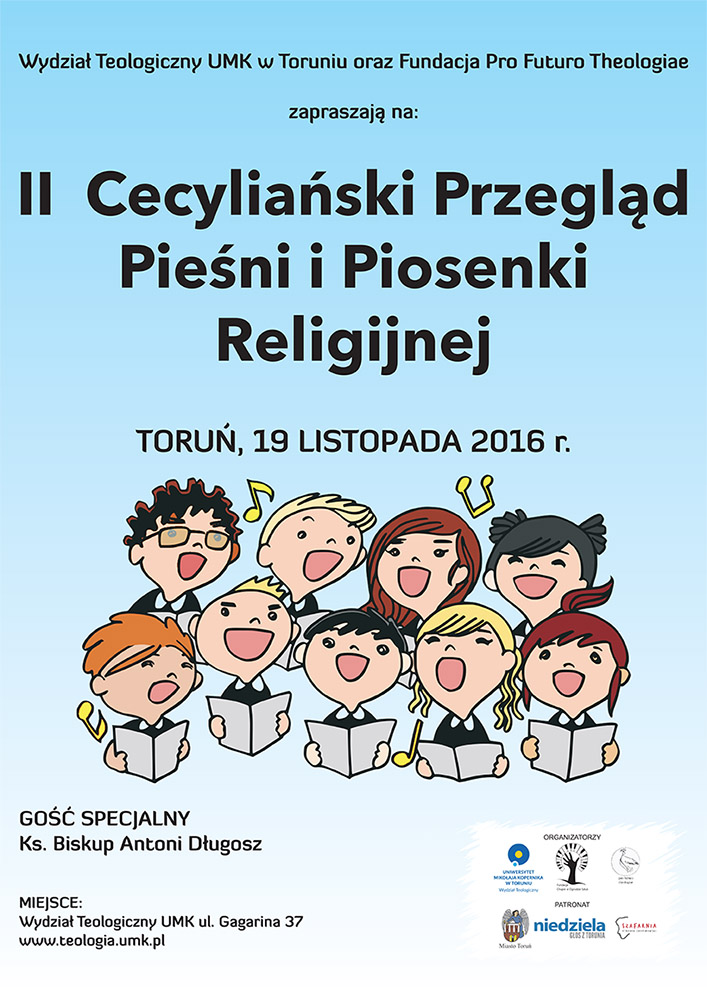 Wydział Teologiczny UMK oraz Fundacja "Pro Futuro Theologiae" zapraszają na II Cecyliański Przegląd Pieśni i Piosenki Religijnej skierowany do scholi i zespołów wokalnych z diecezji toruńskiej, włocławskiej oraz pelplińskiej oraz innych diecezji z całej Polski. Chcemy nawiązać do tradycji uroczystych obchodów dnia patronki muzyki kościelnej Św. Cecylii. Przegląd odbędzie się 19 listopada 2016 na Wydziale Teologicznym UMK w Toruniu, a gościem specjalnym będzie ks. bp Antoni Długosz.