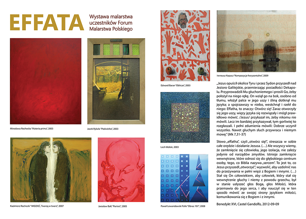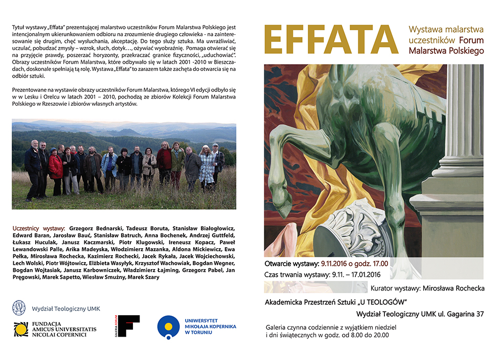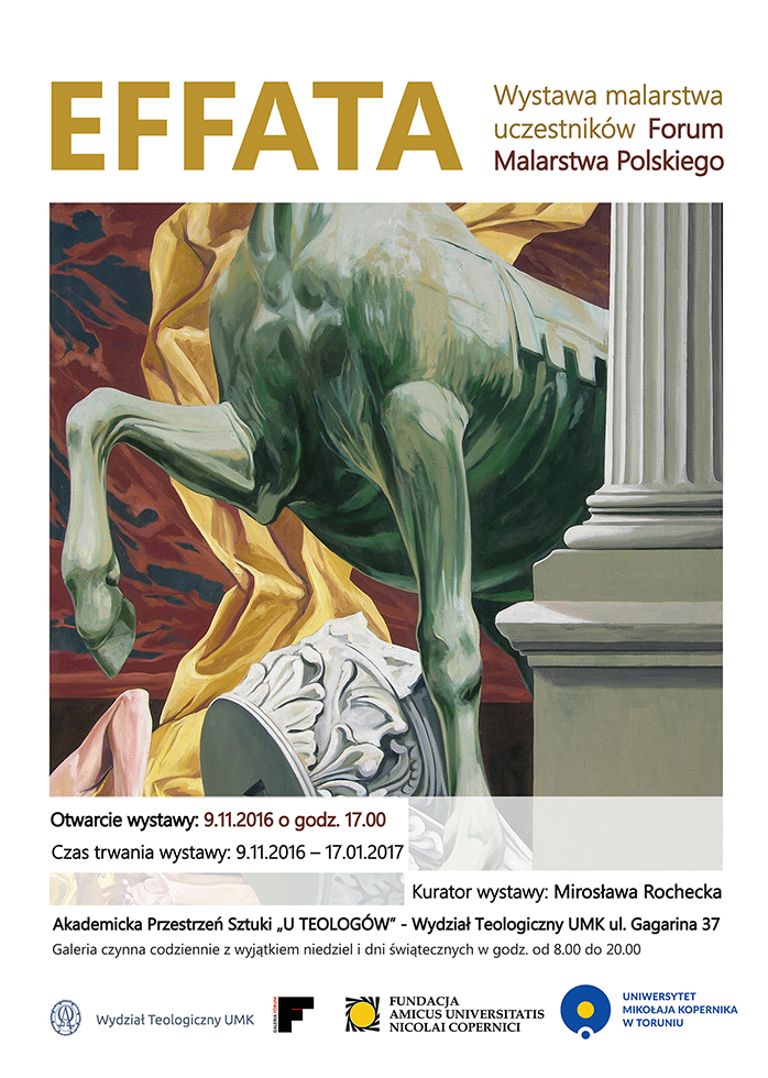 W dniu 9 listopada 2016 roku (środa) o godz. 17.00 nastąpi otwarcie kolejnej edycji Akademickiej Przestrzeni Sztuki "U Teologów". Tym razem prezentowana będzie ekspozycja "EFFATA. Wystawa malarstwa uczestników Forum Malarstwa Polskiego. Kuratorem wystawy jest prof. Mirosława Rochecka. Ekspozycja będzie dostępna od 9 listopada 2016 roku do 17 stycznia 2017 roku w godz. 8.00-20.00 na Wydziale Teologicznym (z wyjątkiem niedziel i dni świątecznych).
