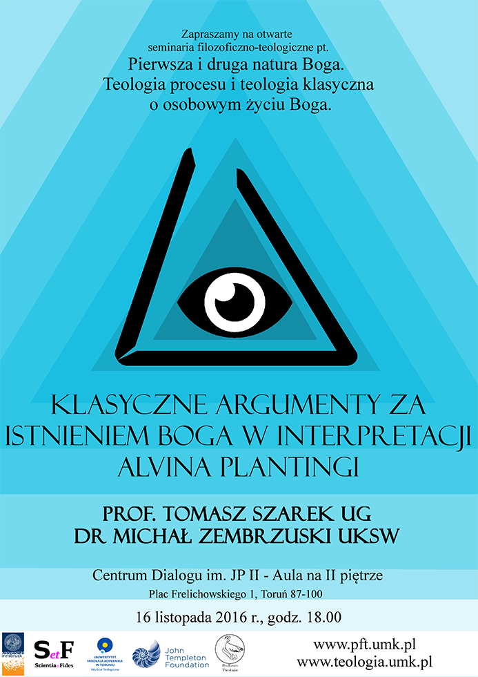 Kolejne spotkanie odbędzie się 16.11.2016r. o godz. 18:00 w Centrum Dialogu im. JPII Pl. Frelichowskiego 1 w Toruniu (przy Seminarium Duchownym) w Auli na II piętrze. Prelegenci prof. Tomasz Szarek (UG) oraz dr Michał Zembrzuski (UKSW) podejmą się tematu „Klasyczne argumenty za istnieniem Boga w interpretacji Alvina Plantingi".
