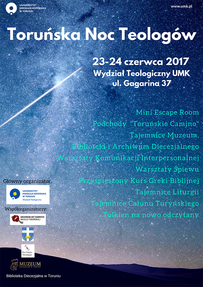 W nocy z 23 na 24 czerwca odbędzie się Toruńska Noc Teologów organizowana przez Wydział Teologiczny UMK. Całonocne wydarzenie poprzedzi rozpoczęte o godzinie 18:00 czuwanie modlitewne na dobry początek. Główne atrakcje rozpoczną się o godzinie 19:15.